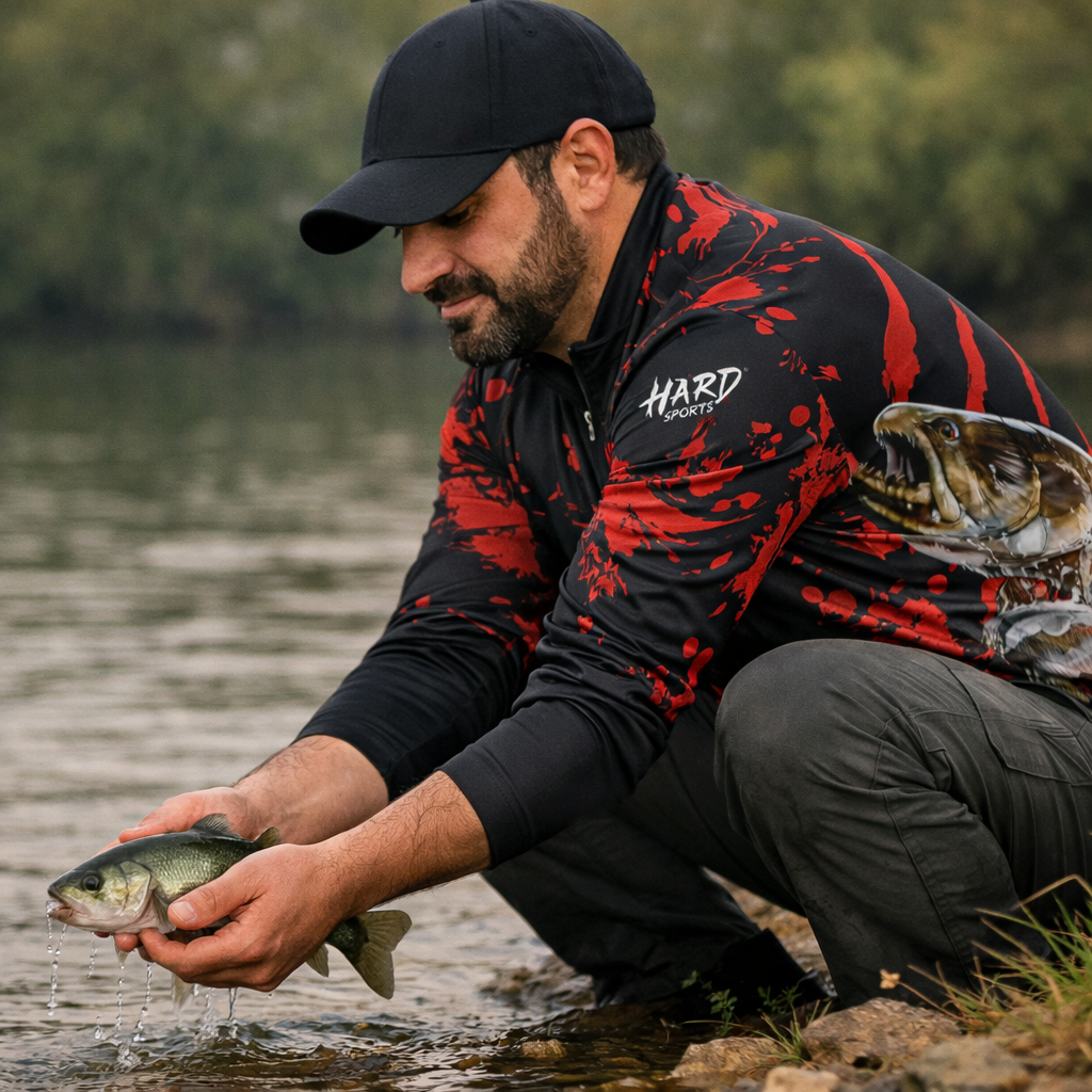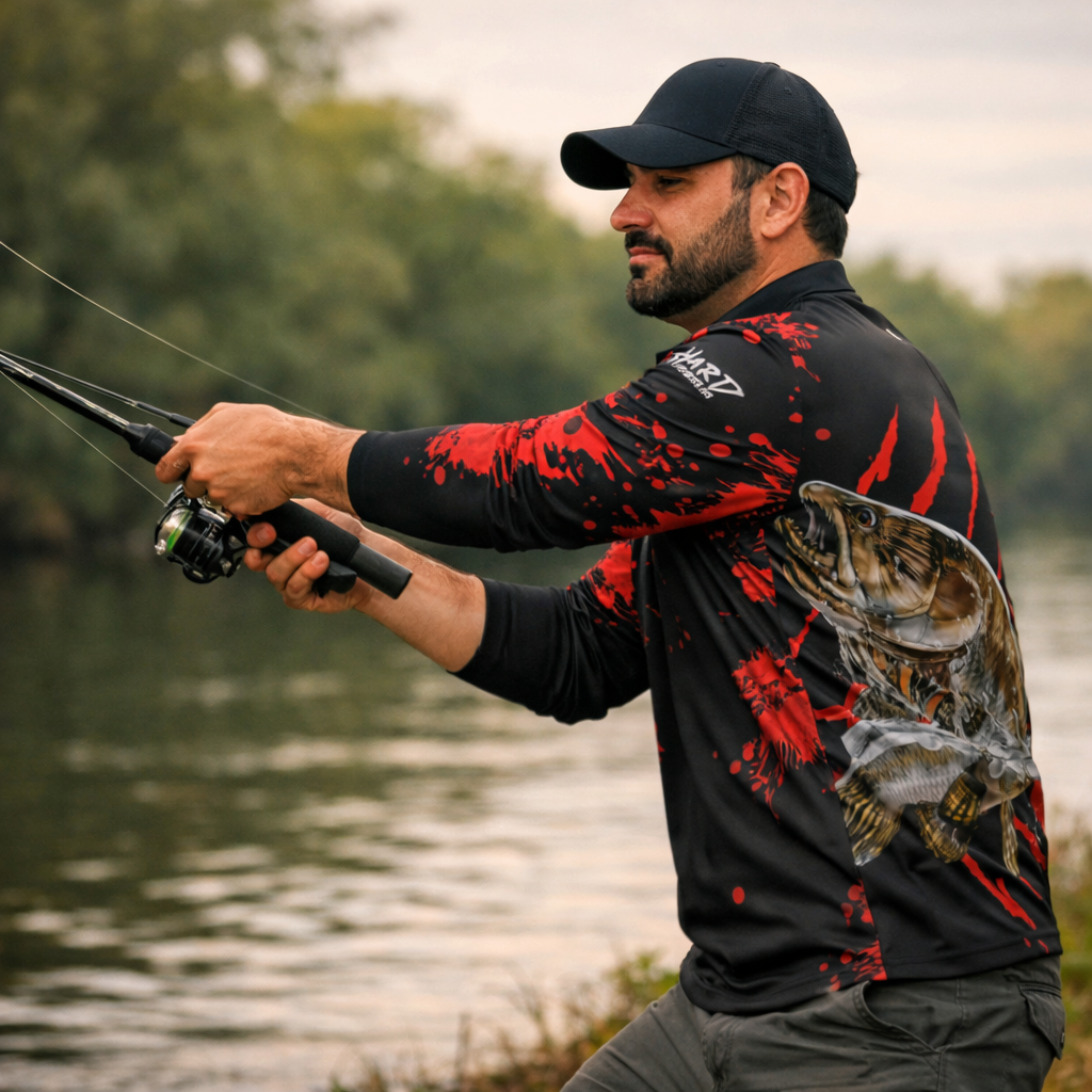 O caimento ficou top e dá pra sentir que é bem feita. Usei no sol e ajudou muito, principalmente no braço e pescoço. E o melhor: não prende na hora do arremesso e nem incomoda com a vara.