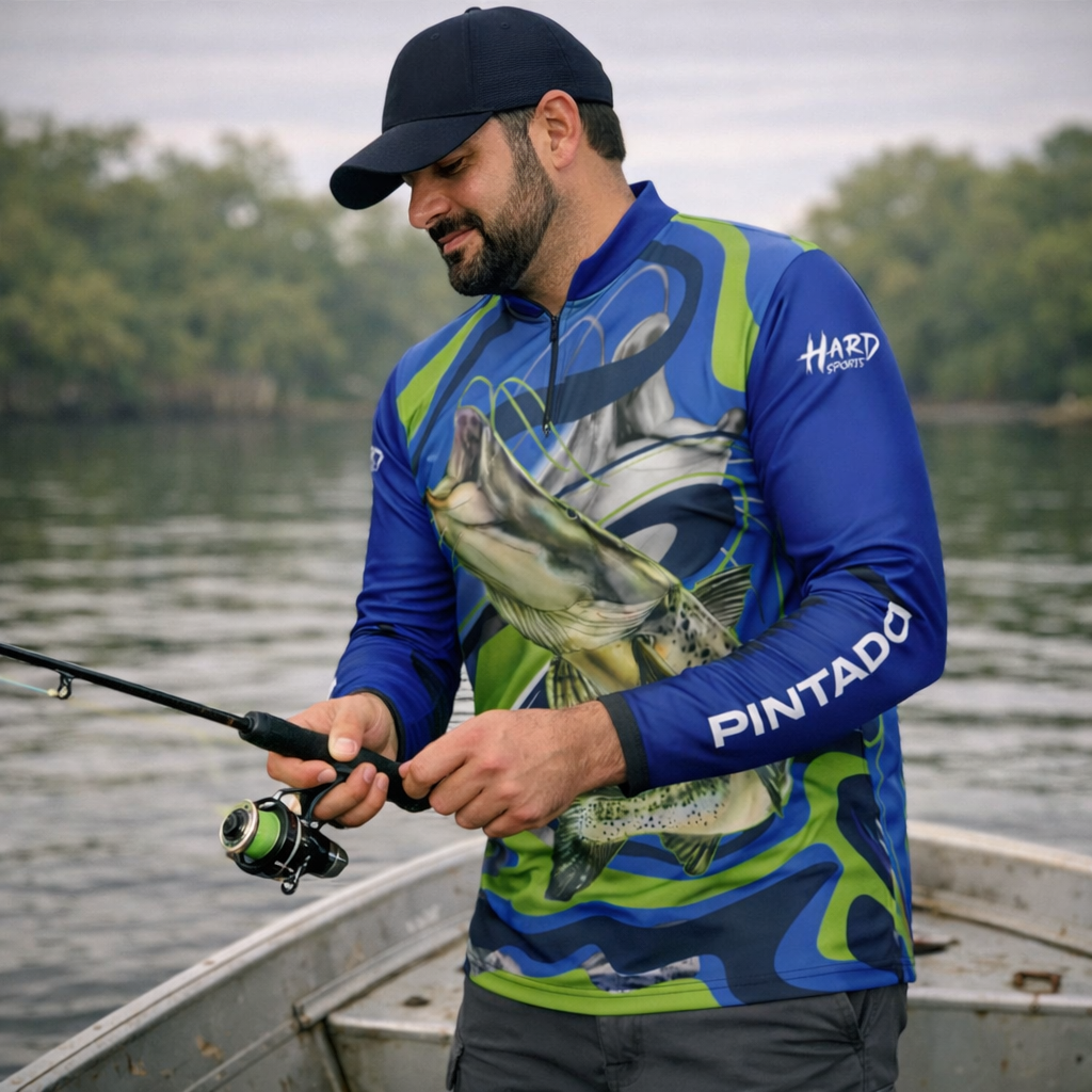Tecido leve e respirável pra você pescar sem virar “sauna”. Liberdade total nos braços e secagem rápida quando respinga água — conforto do início ao fim.